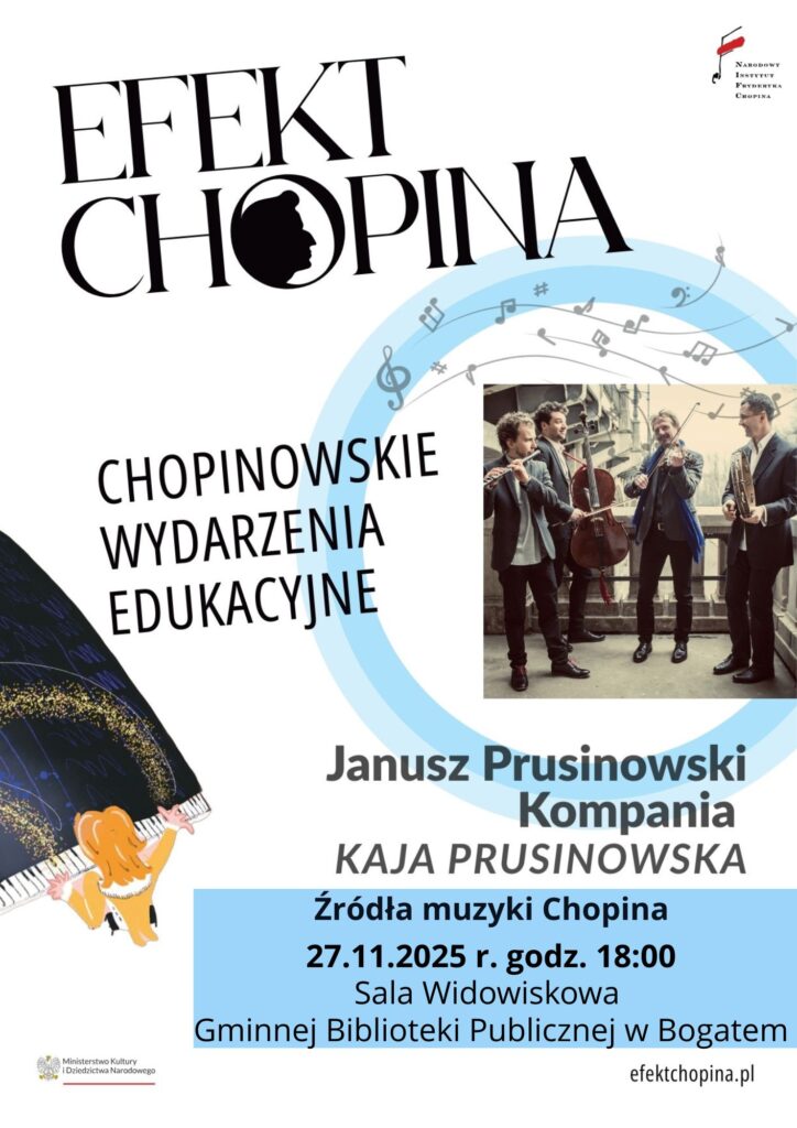 Koncerty edukacyjne „Źródła muzyki Chopina” w ramach programu „Efekt Chopina” od 27 listopada do 12 grudnia 2025 roku odbędą się w 5 miejscowościach na obszarze LGD „Północne Mazowsze”. .