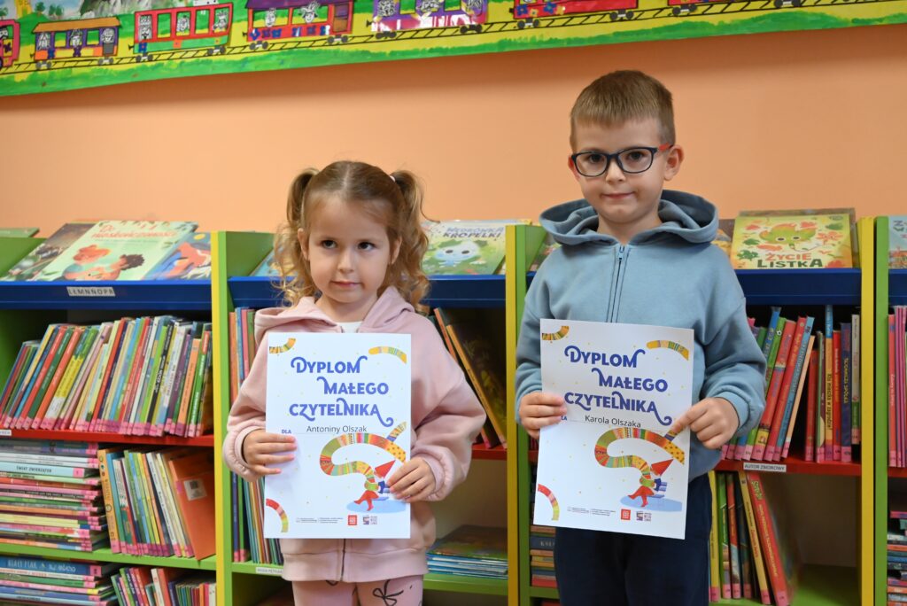 Tosia i Karol dołączyli do grona Małych Czytelników! Otrzymali już swoje dyplomy oraz nagrody w ramach ogólnopolskiej akcji „Mała Książka – Wielki Człowiek”.