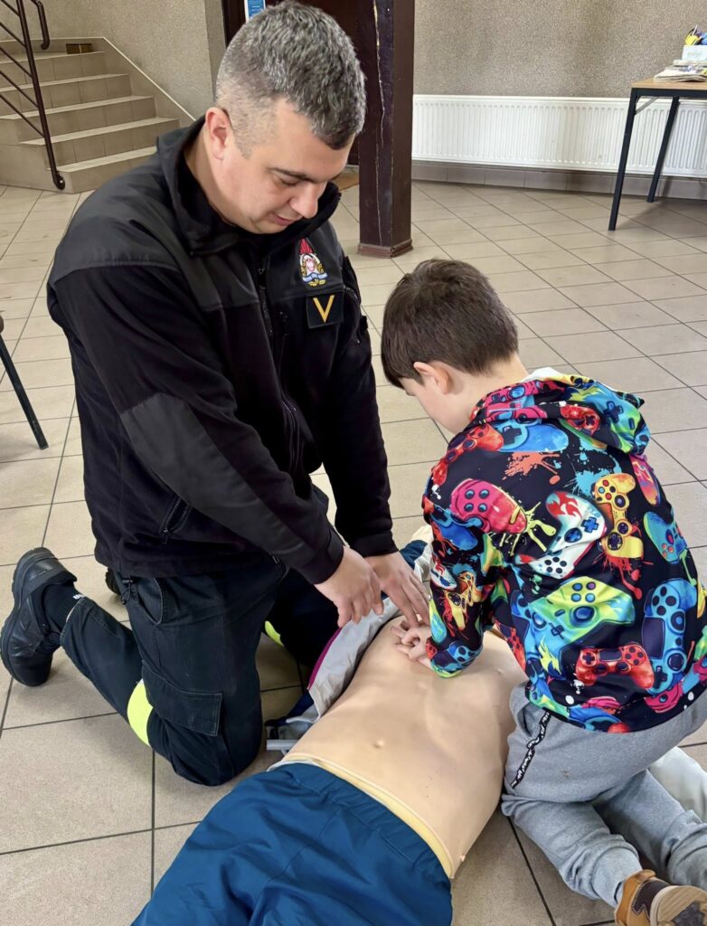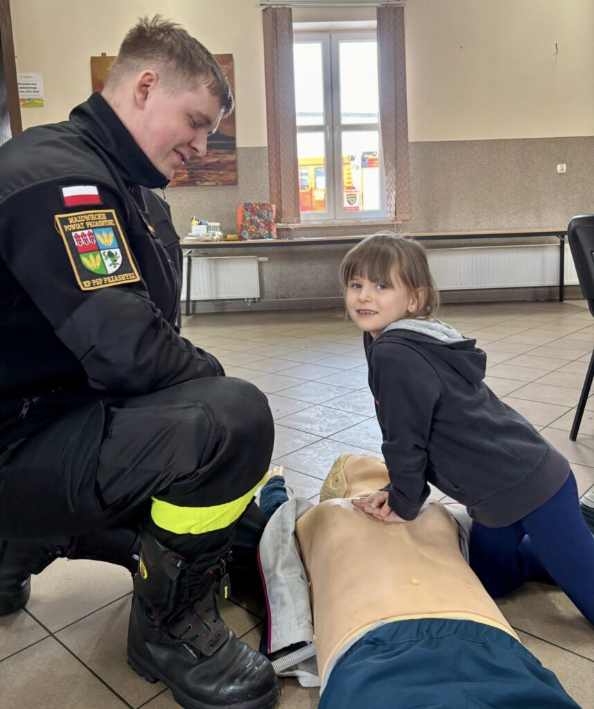 👨🚒 Trzeciego dnia strażacy z PSP w Przasnyszu przybliżyli uczestnikom swoją pracę i podstawy pierwszej pomocy, a dzieci wykonały laurki dla babć i dziadków.